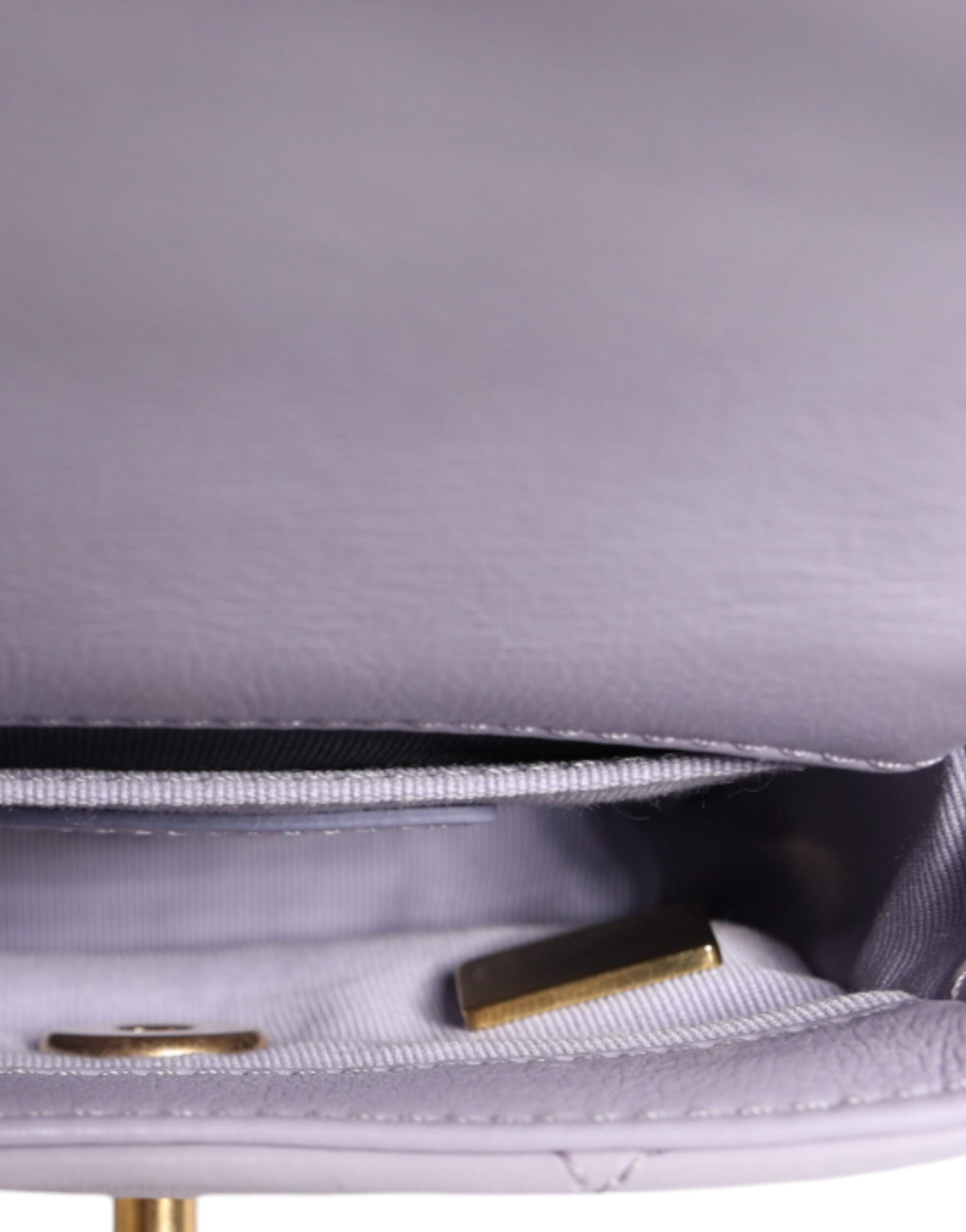 This Chanel Blue Quilted Calfskin Framing Chain Flap Mini Crossbody Bag is a stunning blend of elegance and practicality. Crafted from luxurious light purple calfskin leather, it stands out with its unique color and exquisite design.